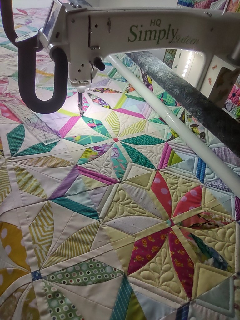 Ik werk op een Handiquilter Simply sixteen longarm quiltmachine. Daar passen quilttops tot een breedte van 250 cm op. Ik quilt bij voorkeur met Aurifil of Glide garens, maar overleg is mogelijk.